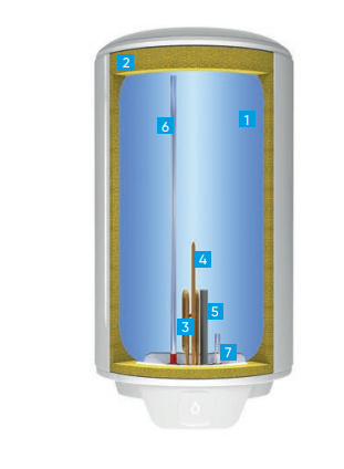 - ✔Deflektor zimnej wody - jego odpowiedni kształt oraz ukierunkowanie wylotu gwarantuje właściwą wymianę cieplną oraz brak mieszania się wody zimnej z wodą już ogrzaną we wnętrzu zbiornika, co w efekcie owocuje wysoką sprawnością urządzenia.