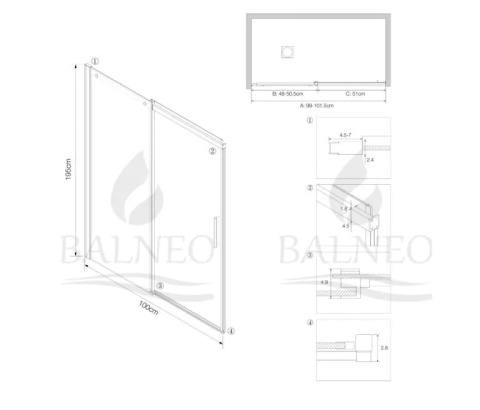 • BALNEO Drzwi prysznicowe do wnęki przesuwane 100x200cm profile czarne