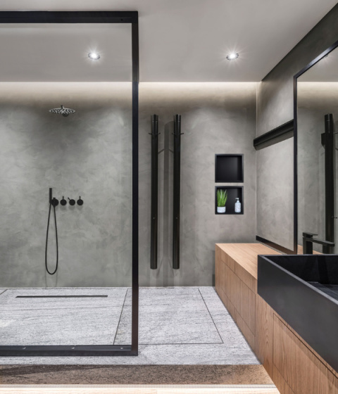 Odpływy liniowe dostępne w kolorze ponadczasowej eleganckiej stali nierdzewnej czy stylowej czerni, szczególnie pięknie wkomponują się w surowe, wyrafinowane, pełne szarości, nowoczesne łazienki industrialne.