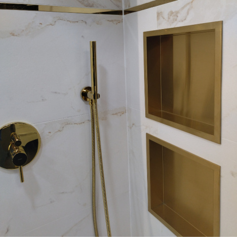 Półki wnękowe w kolorze złotym szczególnie dobrze wkomponowują się w surowe, wyrafinowane, pełne szarości pomieszczenia i wnętrza industrialne typu współczesne lofty. Wykonane z wysokiej jakości stali nierdzewnej półki wnękowe WALL-BOX nie są narażone na korozję związaną z wodą i wysoką wilgotnością panującą w łazience czy kuchni.