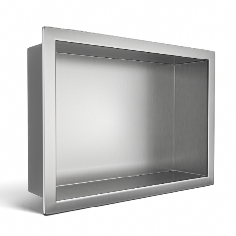 Półki wnękowe ze stali INOX szczególnie dobrze wkomponowują się w surowe, wyrafinowane, pełne szarości pomieszczenia i wnętrza industrialne typu współczesne lofty. Wykonane z wysokiej jakości stali nierdzewnej półki wnękowe WALL-BOX nie są narażone na korozję związaną z wodą i wysoką wilgotnością panującą w łazience czy kuchni.