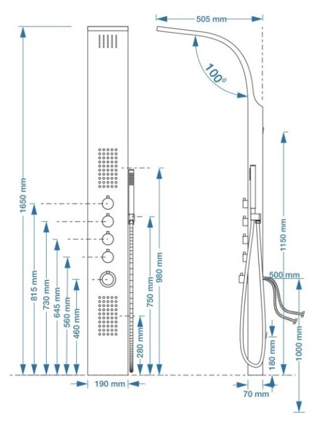 Duży wybór funkcji prysznicowych powoduje że możesz zarówno odpoczywać nabierać sił pod prysznicem jak również wziąć szybki prysznic przed dalszą podróżą. Podstawową funkcją natrysku jest deszczownica prysznicowa oraz dla urozmaicenia dysze hydromasażowe. Dysze hydromasażu spowodują że możesz się odprężyć i zrelaksować zmęczone ciało.