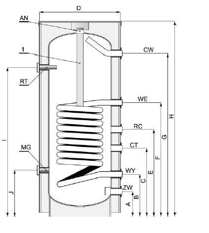 Wymiennik c.w.u. z wężownicą spiralną 150L stojący: