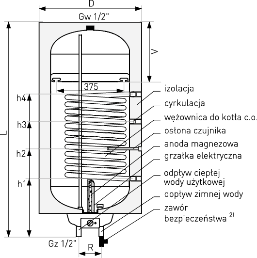 Szybkie nagrzanie wody w wymienniku c.w.u. zapewnia wężownica spiralna o dużej powierzchni. W połączeniu z wydajną izolacją z gęstej pianki poliuretanowej gwarantuje długie utrzymanie temperatury wody i ekonomiczną pracę.
