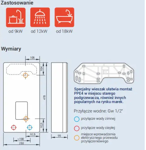 - specjalnie zaprojektowana obudowa PPE4, wyposażona w unikalny wieszak, umożliwia łatwy montaż podgrzewacza w miejsju starego.