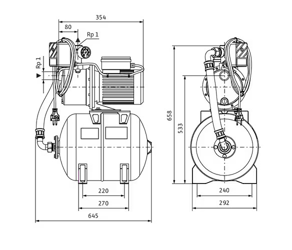 Sterowanie pompą jest poprzez zestaw sterowniczy z ciśnieniowym naczyniem przeponowym, przełącznikiem ciśnieniowym i manometrem (0 - 6 bar).