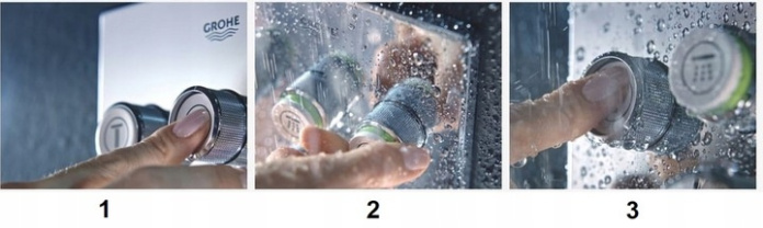 GROHE SmartControl to innowacyjny system prysznicowy, który umożliwia w prosty sposób regulować natężenie i temperaturę wody, a także pozwala na wybór preferowanego strumienia i przełączanie pomiędzy deszczownicą i prysznicem ręcznym. Wystarczy dotknąć pierścień GROHE ProGrip na uchwycie, aby zwiększyć strumień wody – z wariantu ekologicznego do pełnego przepływu – lub go zmniejszyć. Naciśnij ponownie, aby zatrzymać wodę. SmartControl posiada również funkcję zapamiętywania preferowanych ustawień.