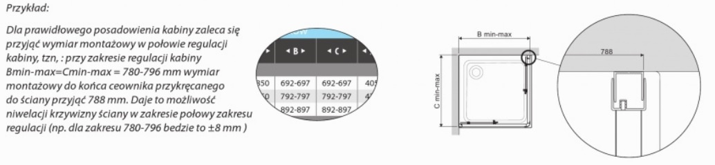 Zakres regulacji w kabinach prysznicowych zaprojektowano tak, aby dawał możliwość niwelacji krzywizny ścian. Dodatkowo wspomaga on optymalne wyregulowanie kabiny w obszarze domykania drzwi, spasowania uszczelek czy ustawienia względem brodzika.